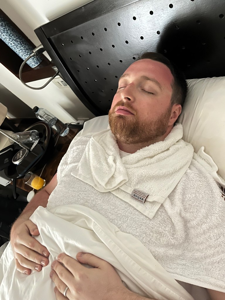When we arrived in Koh Samui Ryan, in his infinite wisdom, decided to go for a swim without any suncream on. We can’t have been in for more than 30 minutes; but as it turns out that’s long enough! When we awoke in our new hotel room he was suffering with some pretty nasty heatstroke. Thankfully he married Olivia, who is basically a nurse. She looked after him all day with cold towels, plenty of after sun and regular reminders to hydrate.