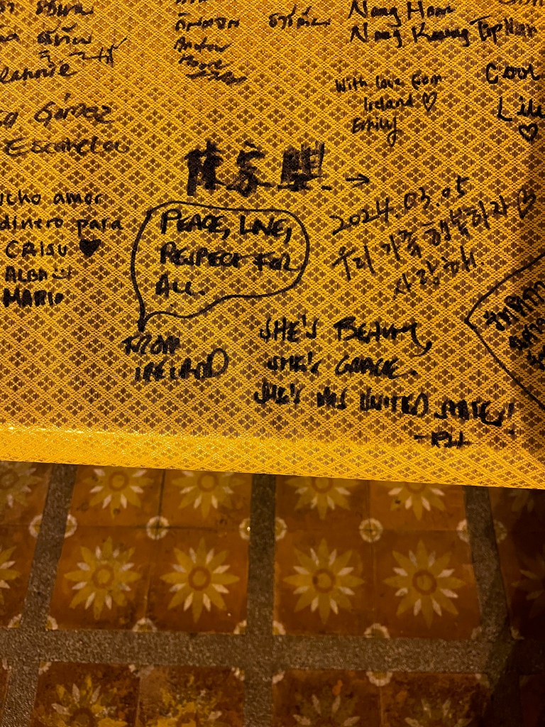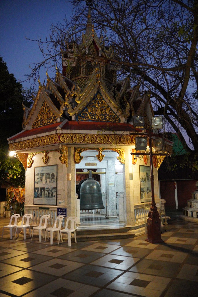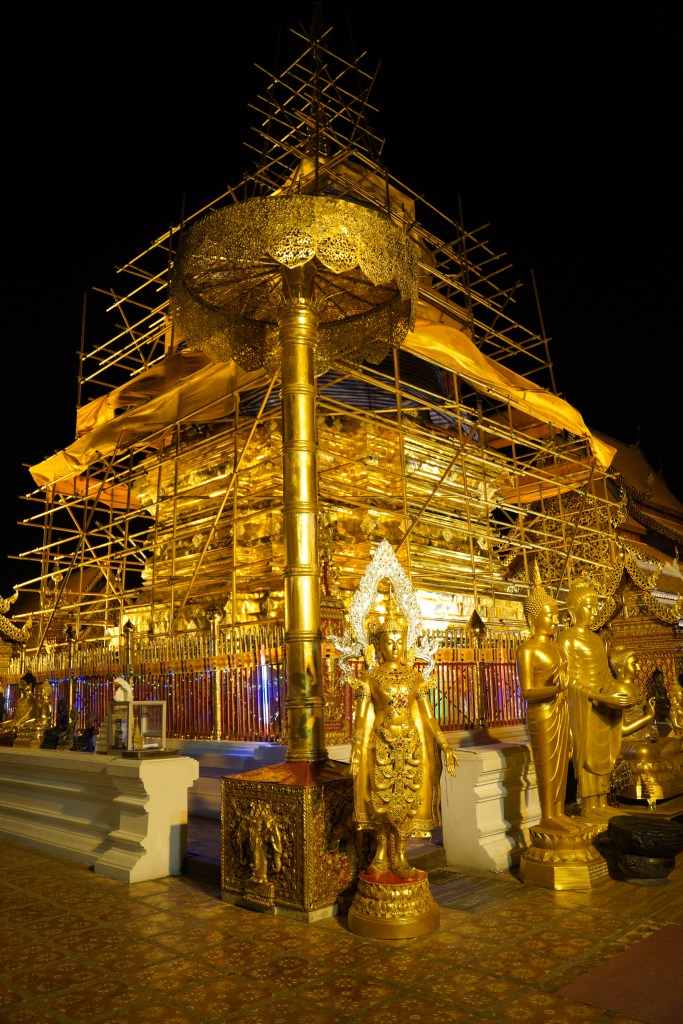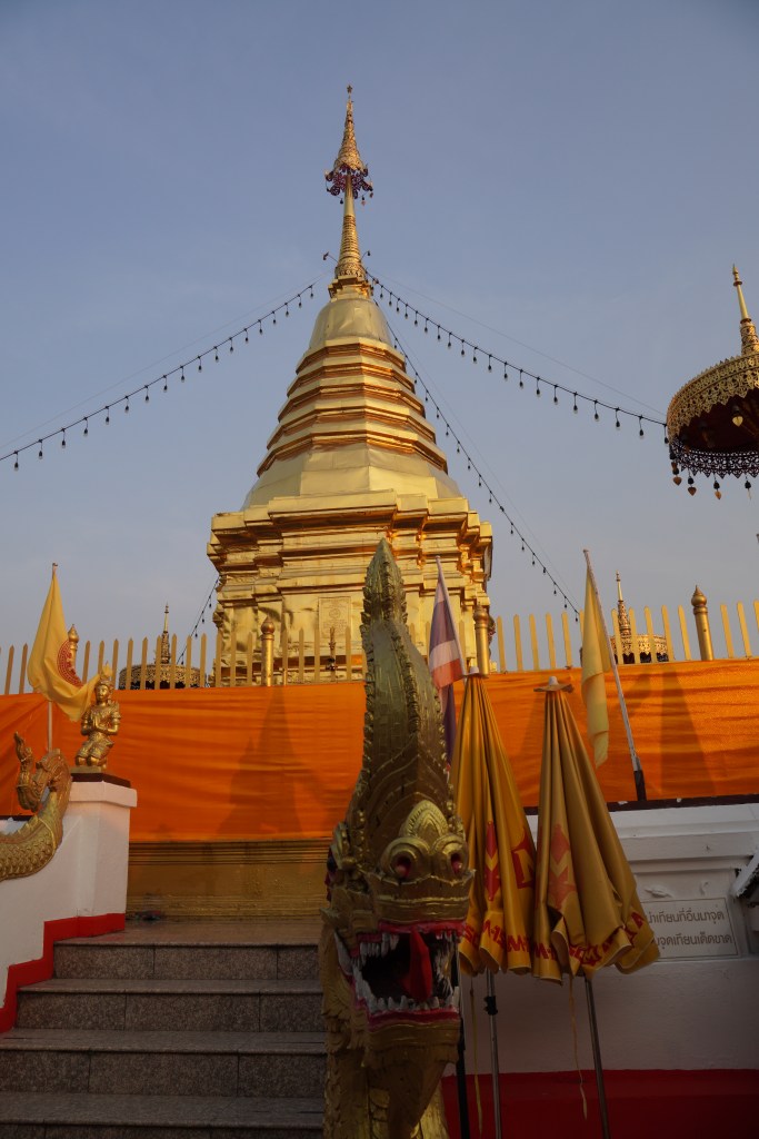 Back on the scooter we made it up the winding road to Wat Doi Suthep just as the sun had gone down. They weren’t lying when they said there were a lot of steps to get up the Wat. There was a tourist tax of 30THB to pay for a ticket when we eventually did make it. With that we were free to walk about. We were quite glad in the end that we got there when we did, there weren’t very many tourists so it was nice to be able to just walk around at our own pace. I imagine during the day it would be really busy and a lot less pleasant so we were glad that it worked out the way it did! The Wat itself was lovely and this was definitely the golden place I had read about on other blogs, however unfortunately the main stupa was covered in scaffolding when we visited. It didn’t take away too much from our experience and they even have gold fabric wrapped around the scaffolding which visitors had written messages on.