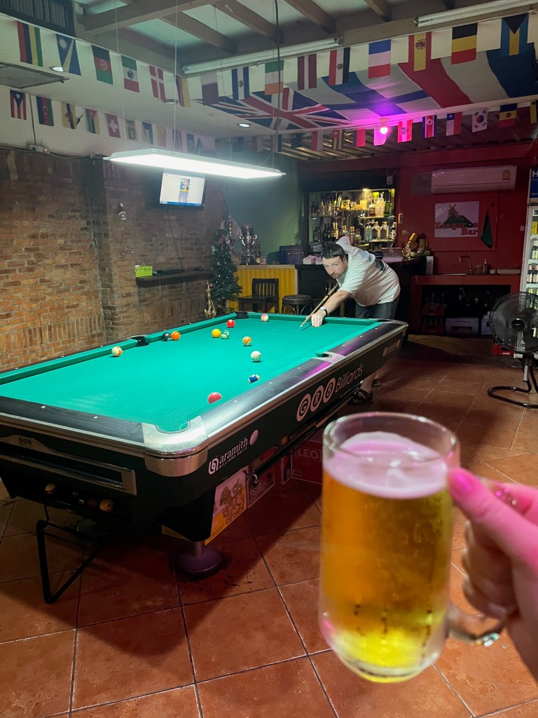 Once we were safely back on Thai soil we “Grabbed” it into the old town where we were staying. Chiang Mai old town is really nice, on the river, with the old castle walls surrounding it and making it this perfect square in the middle of Thailand’s bustling second largest city. But when you’re in the old town you wouldn’t really know you were in a city at all. Great restaurants serving up cheap Thai dishes, like our favourite Khao Soi, are so easy to come by; as are bars, many of which have pool tables and darts to keep you entertained. Our first night in Chiang Mai we had a delicious meal at Arroy Dee on the main street of the old town, then crossed the road to Kangaroo bar where we spent the next couple of hours drinking Chang and playing pool. We were able to play DJ there too and pick what music we wanted on, an added bonus!