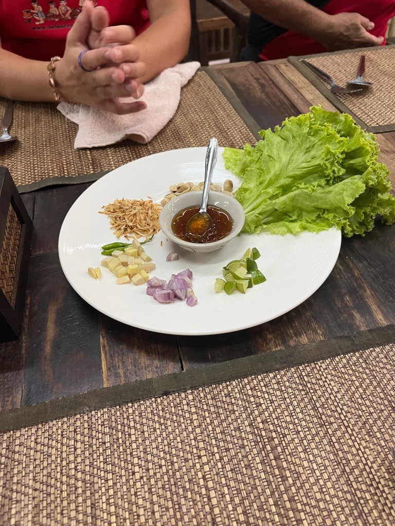 Before we began cooking, we sampled a traditional Thai welcome snack – Meang Kum – that is normally served to guests that you are cooking for. It involves filling a lettuce leaf with a little onion, ginger, chilli, lime, toasted coconut and peanuts topped with some sweet syrup and wrapped up and eaten in one mouthful. It was absolutely delicious and this was before we’d even got to the main event!