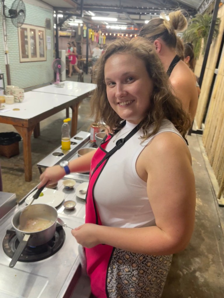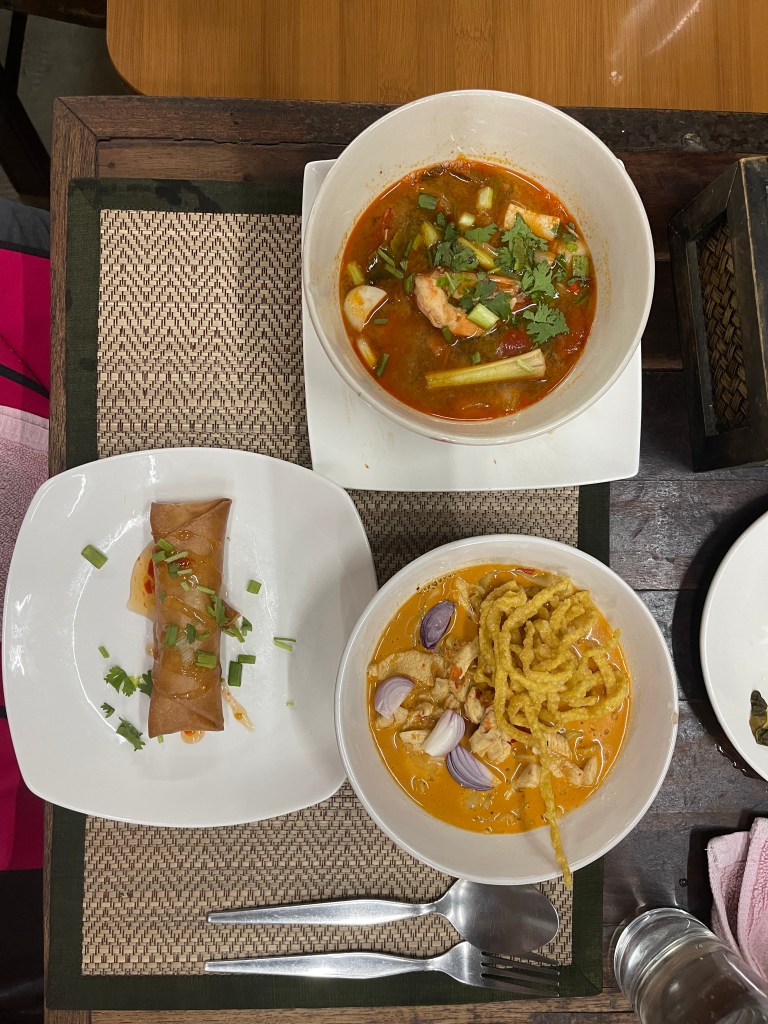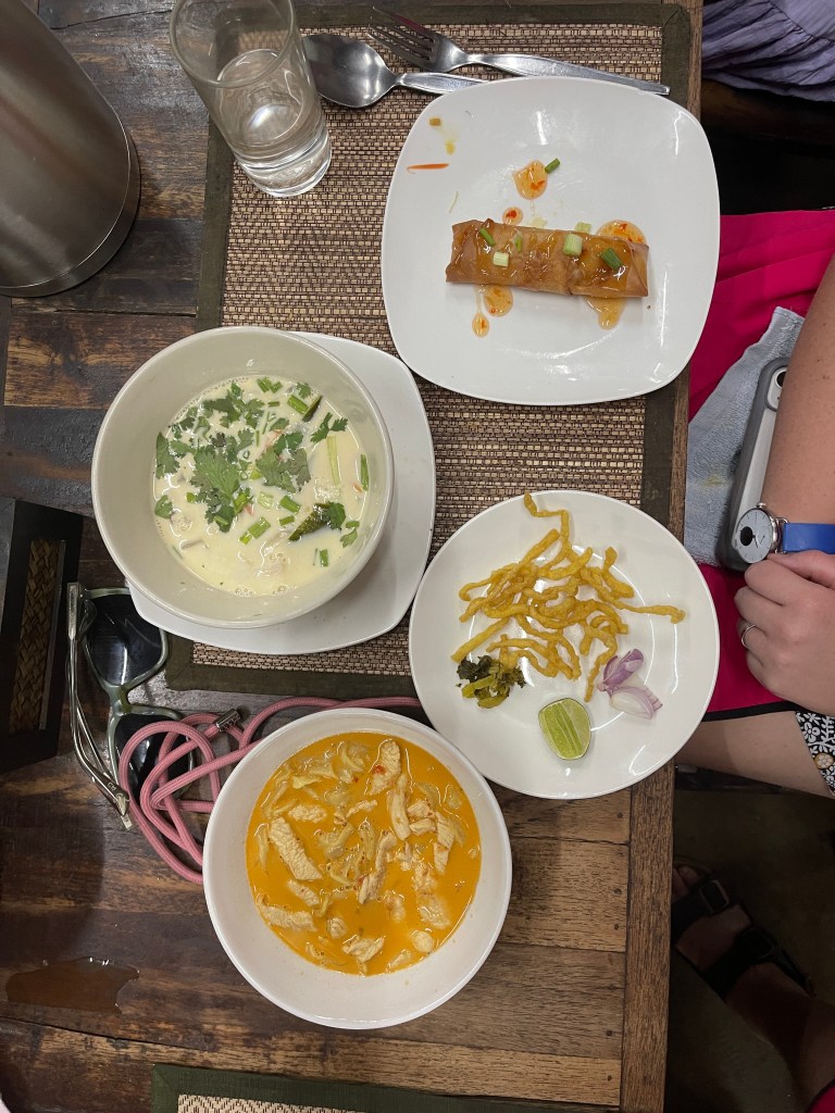 We then made our soups; I went with Tom Kha Kai, or as Olive called it, baby soup due to its coconut milk base and lack of chillies and Ryan made Tom Yum. Then we were straight into cooking our curries. As you will have gathered by now, we are big fans of Khao Soi, and so neither of us could resist learning to make it ourselves. With the curries made we just had to quickly deep fry the spring rolls and that was us, ready to tuck in!
