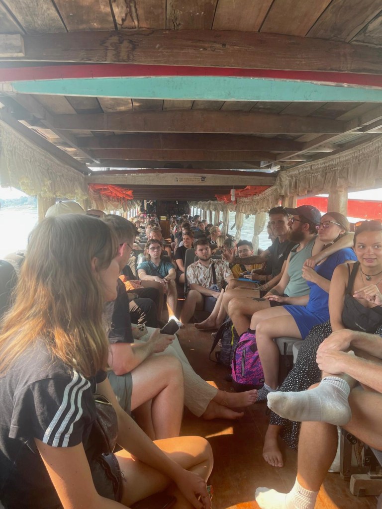 Thankfully it did, so we got what we needed and headed down to the café we had been at the day previous. Here we got some banana pancakes for breakfast and some sandwiches made up to take with us on the boat. Shortly after 9am we went down to the boat and got our bags loaded on. Our seats were at the front which was where all the big bags were being put on, so we waited until nearer the departure time to get onboard. Cosy would be an understatement for the seating arrangements! I should explain that the seats on board are old bus seats that are just set in the boat so if you move they move which can prove to be a bit of a problem! We were all piled on and there were still a lot of people turning up to board the boat. They ended up boarding another boat and thankfully some people from our boat also moved so this gave us a little more room to spread out.
