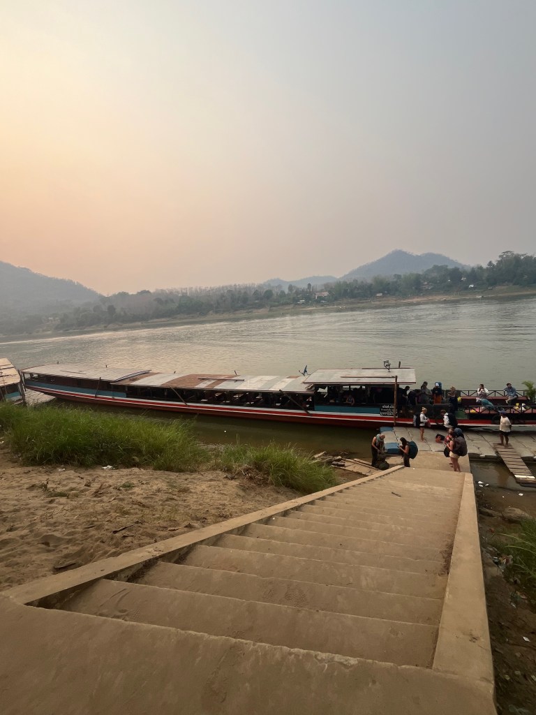 At around 10am we set off down the Mekong, and there wasn’t much else to do but settle in for the 7 hour journey. The scenery was beautiful and the people watching was pretty good too! We had downloaded some shows to watch to help pass the time as well. I wouldn’t say the journey flew by, but it definitely wasn’t as painful as we had anticipated! At around 5pm we arrived in Pakbeng, a little town that’s main purpose seems to be to service the slow boats that stop here everyday. We had booked into a guesthouse and were picked up by a tuk tuk at the pier and taken there. We got some dinner, watched the sunset over the Mekong and toasted that we had survived the first day on the slow boat!